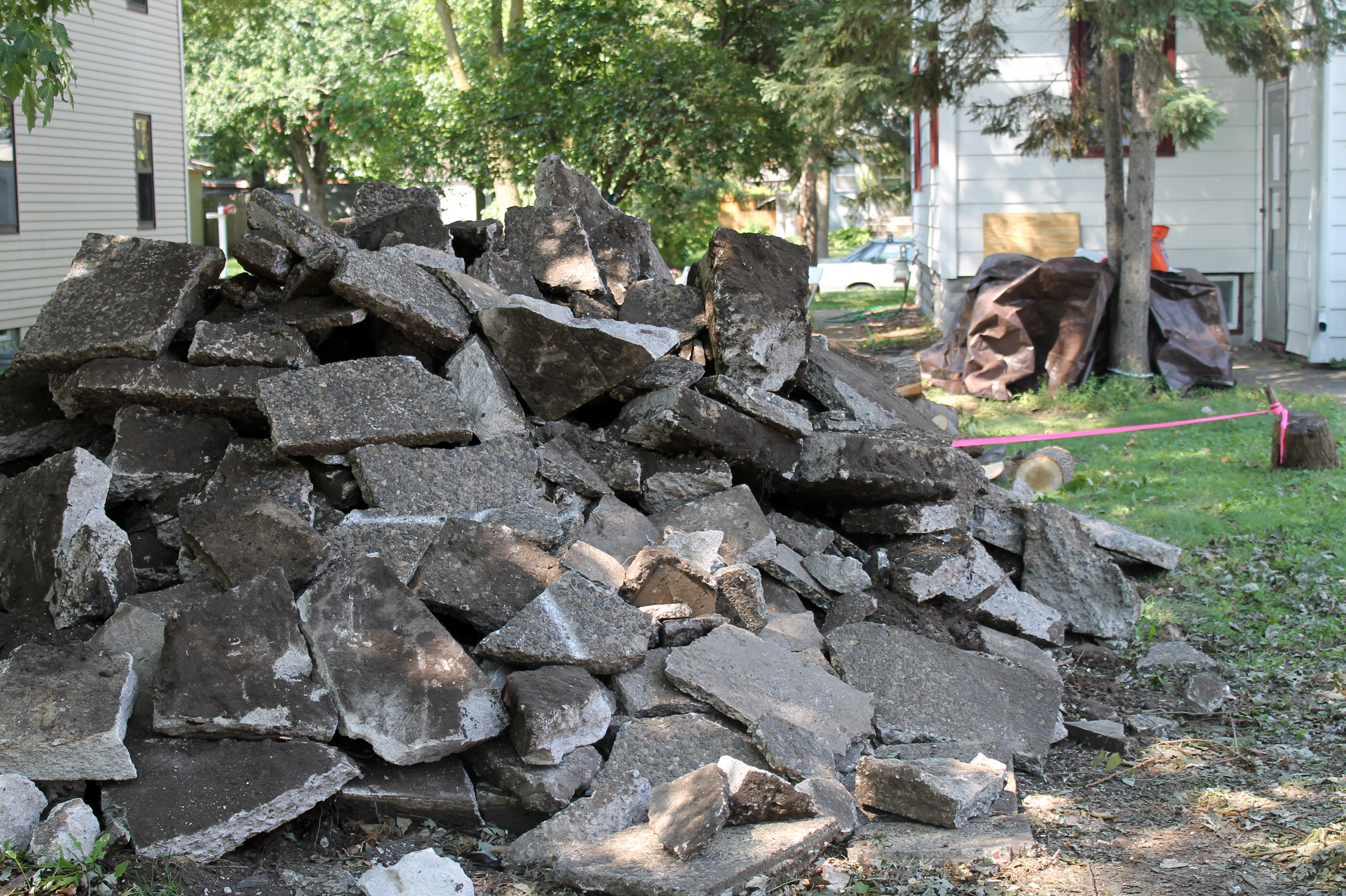 I received a phone call at work on the morning that the concrete contractor showed up with his skid steer to begin demolition. I had explained to him a few days earlier that I wanted to salvage the busted up old slab for reuse. My plan was to use the rubble to build up a base for a landscape waterfall (ever since a visit to Chinese gardens in Suzhou, China during graduate school, I have had a dream of creating a Chinese garden on my property). I figured it would be cheaper than buying rocks. The contractor was calling to confirm that I did indeed want all of the rubble, and if not, he could haul half of it away with the truck that was already on site to remove the dirt. I insisted that I needed all of the rubble. When I returned home that evening and took a look in the backyard, once again, I had my ambitions checked. I now have the highest point in the state of Minnesota in my backyard.