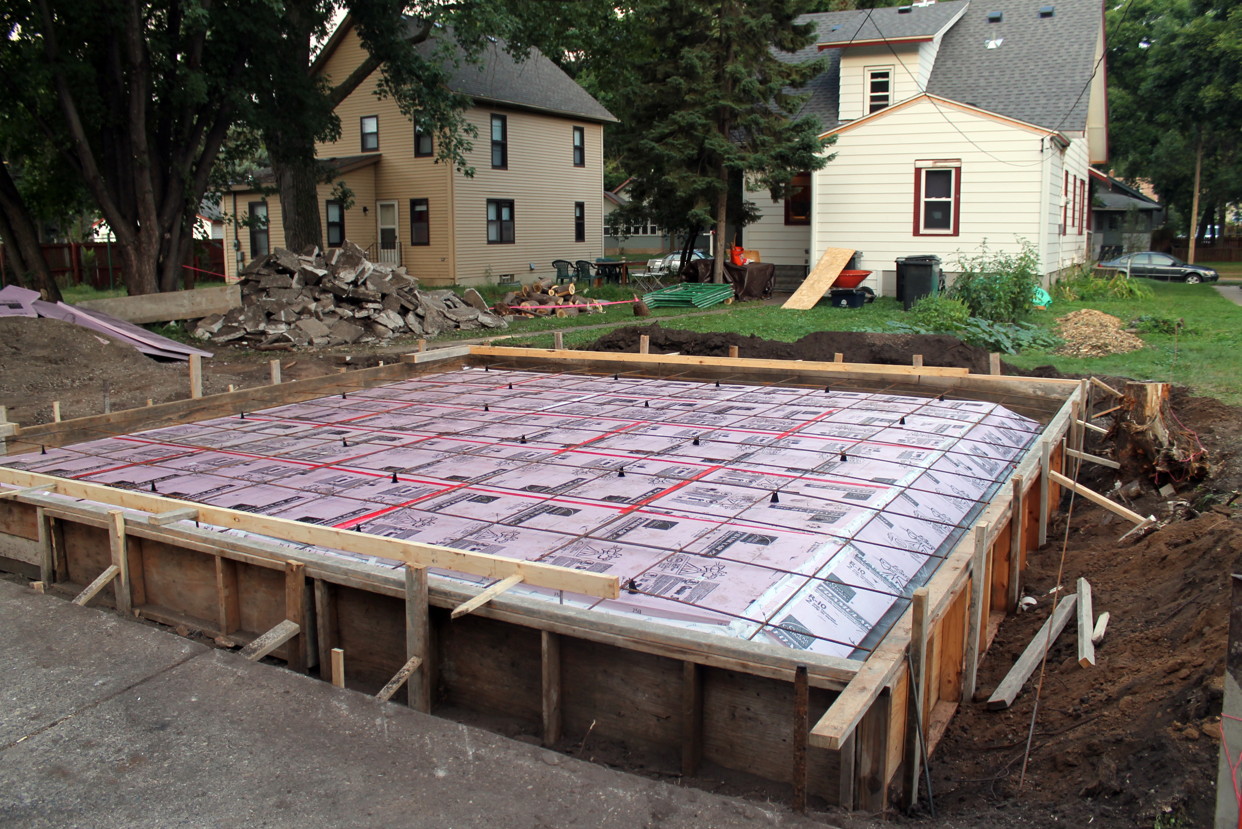 I designed the studio with a frost-protected slab. Here in the Middle, the winter temperatures can get down to -20 degrees Fahrenheit for days at a time and I didn’t want the slab being pushed around by frost heave. Therefore, the downturned slab edge at the perimeter of the slab is deeper than one typically designs for a traditional slab on grade installation, and rigid insulation was placed both vertically along the perimeter, as well as horizontally for two feet away from the bottom of the downturned slab edge. This technique helps to prevent the frost from creeping under the slab. The studio will be heated, so I specified sub-slab insulation as well to prevent too much heat from being lost through the floor.